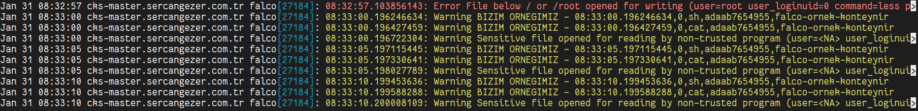 Jan 31 08:33:10 cks-master.sercangezer.com.tr falco[27184]: 08:33:10.199588288: Warning BIZIM ORNEGIMIZ - 08:33:10.199588288,0,cat,adaab7654955,falco-ornek-konteynir